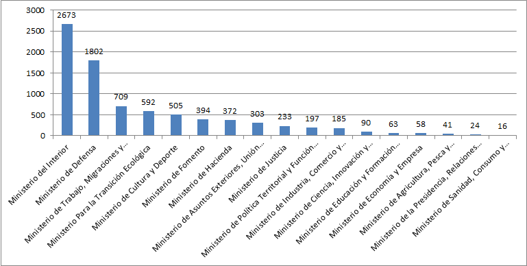 Ondare Ondasunak eta Gizarte Segurantza kontuan hartu gabe, hauxe da higiezin gehien dituen Ministerioa: Barne Ministerioa -ekin2.673, eta gutxien duena Osasun, Kontsumo eta Gizarte Ongizate Ministerioa -ekin 16.