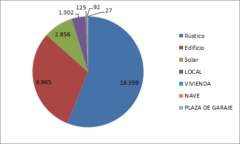 Higiezin-motaren ikuspegitik, 18.359Ondasun higiezinak landa-ondasunak dira. 9.965Eraikinak dira, 2.856orubeak dira, 1.302 Tokikoak dira, 125 Etxebizitzak dira, 92 Nabeak eta 27 Garaje plazak.