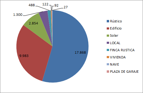 Higiezin motaren ikuspegitik, 17.868Ondasun higiezinak landa-ondasunak dira. 9.983Eraikinak dira, 2.854orubeak dira, 1.300Tokikoak dira, 488 Landa Finkak dira,122Etxebizitzak dira, 92 Nabeak eta 27 Garaje plazak.