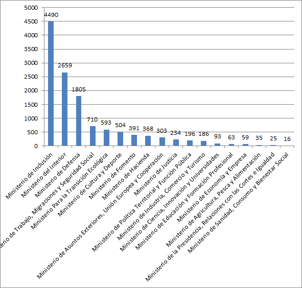 Ondasun higiezin horiek honako hauei dagozkie: 12.730(193 gutxiago) ministerio ezberdinei eta19.799(12 gutxiago) ondare ondasunei. Gizarte Segurantzari buruzko informazioa data honetan eguneratu zen:2019/11/11; Inklusio, Gizarte Segurantza eta Migrazio Ministerioan sartuta dago, eta gainerako ministerioena 2020/05/25ean eguneratu da..