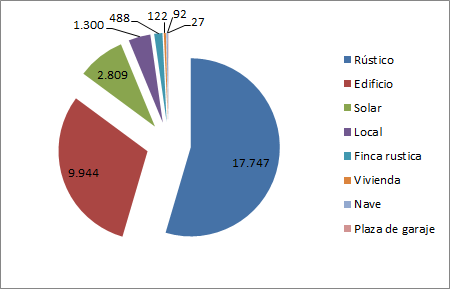 Higiezin motaren ikuspegitik, 17.744Ondasun higiezinak landa-ondasunak dira. 9.944Eraikinak dira, 2.809orubeak dira, 1.300Tokikoak dira, 488 Landa Finkak dira,122Etxebizitzak dira, 92 Nabeak eta 27 Garaje plazak.